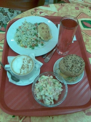 Чего я набрал на поднос, можно увидеть на представленном фото. Хлеб фермерский, напиток клюквенный, салат тропикана, котлета куриная с овощами, рис по-гавайски (это круто!), кофе капучино в сопровождении чудной корзиночки с ягодами. Скидочка составила 9 руб. 75 коп. Таким образом, за всё это великолепие автор заплатил 315 руб. 53 коп.