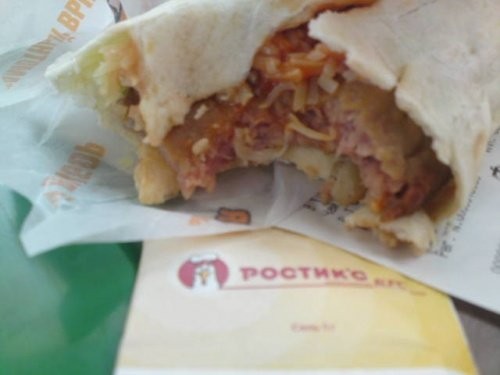 И капец....хотелось бы выразиться по-жестче...! На фотографии изображен мясной раппер-типа котлетки с офощами в лаваше. Вроде казалось, что у такого мирового бренда, как KFC-Ростикс должны быть отточены до мелочей все тех.процессы приготовления пищи, а на деле, лично меня накормили сырым фаршем (видно на фото, что вся середина не прожарена) и отбили желание, что либо кушать у них.