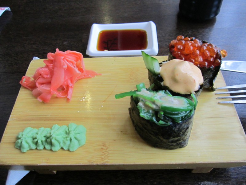 Конечно, рыбка. В первый раз это был салат зеленый с лососем, во втором случае предался поеданию гунканов - икра лосося, острый угорь гункан и чукка гункан. Цены на гунканы довольно забавные, о цене на блюдо с лососем, так это и вовсе даром - 239 рублей. Зная, как у нас теперь с поставками лосося, следует поспешить в Япона Мама, чтобы продегустировать какое-нибудь блюдо из норвежского лосося ... Что сказать, качество отменное!