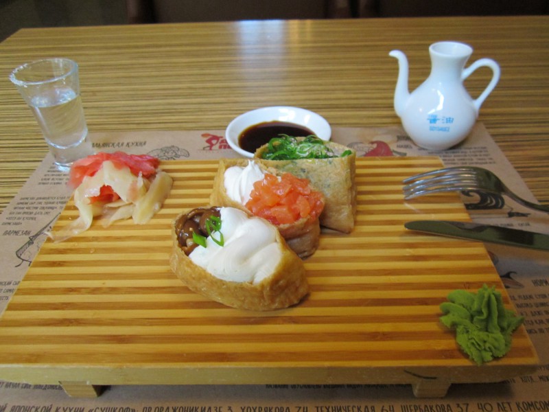 Итак, прежде всего скажу, что в кафе традиционно летом работает веранда. Однако хотелось посидеть в прохладе и попробовать японской еды так, как если бы я ее никогда прежде не ел. Работала мой любимый официант Ольга. Сразу заказал же, практически без особых сомнений заказал инари - их в меню всего шесть - вот, я и заказал три первых, как они там выстроились на картинке.