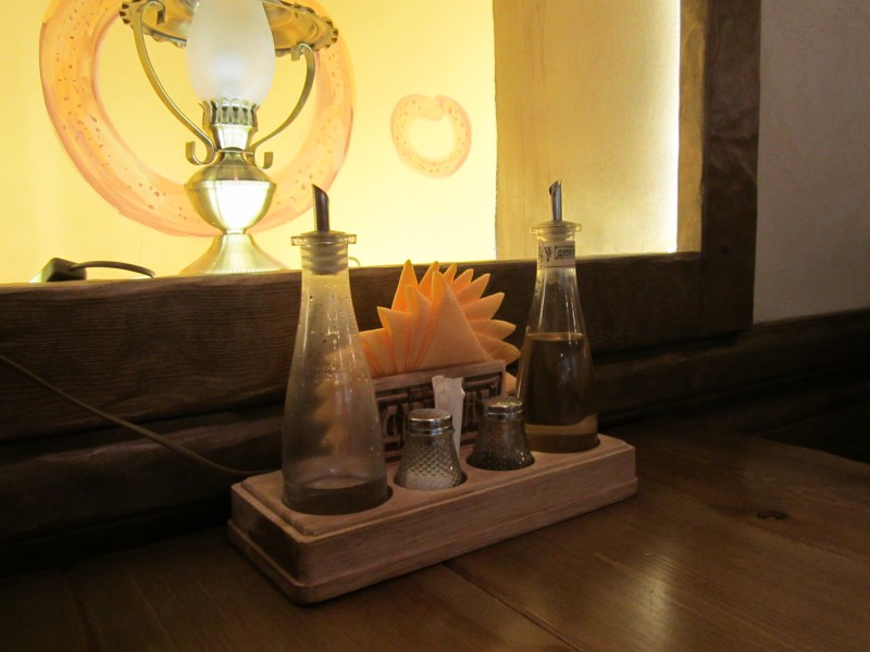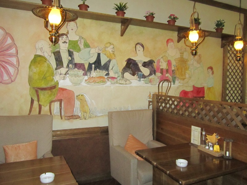 Интерьер безусловно «русский», необычный, стильный и интересный, пропитан теплом и уютом, наполнен деталями и акцентами: «основательная» мебель, тканые салфетки на столах, старинный буфет с самоваром. Фото и афиши начала XX века полностью отражают городской традиционный быт того времени.