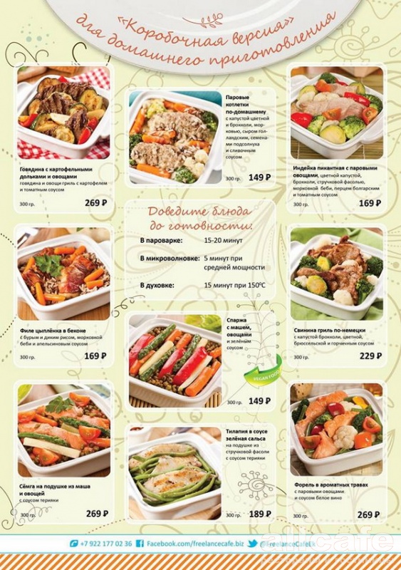 Freelance Cafe специально для тех у кого нет много времени, предлагает «доготовить» вкусные и здоровую блюда из кафе у себя дома. Коробочные версии котлет, рыбы, филе цыпленка и индейки с овощами на пару, говядины и свинины с гарнирами и множество других блюд можно самостоятельно довести до готовности в микроволновке, пароварке или духовом шкафу.